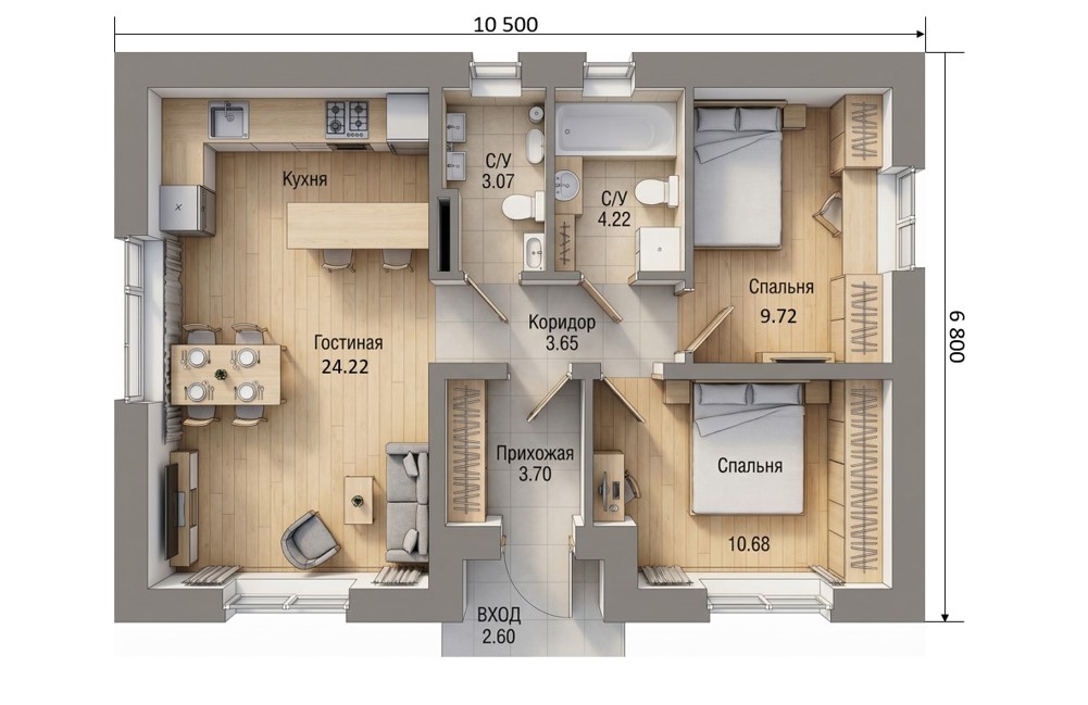 - Утепление пола 100 мм, сухая стяжка по плите 60-70 мм.