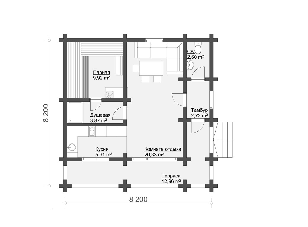 Рациональная планировка включает просторную комнату отдыха с кухонной зоной, парную, душевую, санузел и удобный тамбур. Все помещения расположены так, чтобы пользоваться баней было максимально комфортно в любое время года. Терраса расширяет зону отдыха и позволяет проводить время на свежем воздухе после парения.