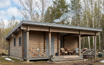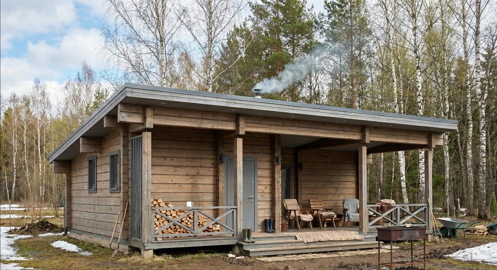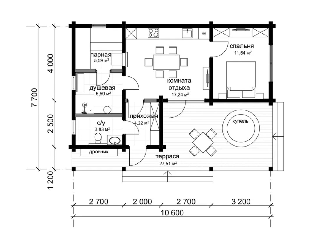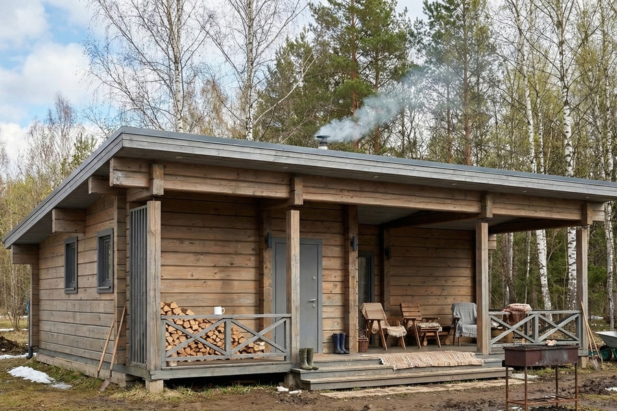 Архитектура бани выполнена в современном стиле с натуральной древесиной, которая создает теплую и естественную атмосферу. Панорамные окна наполняют помещение светом, а продуманная планировка обеспечивает удобство как для семейного отдыха, так и для приема гостей. Здесь легко провести вечер с друзьями, устроить банный ритуал или остаться на ночь в комфортной спальне.