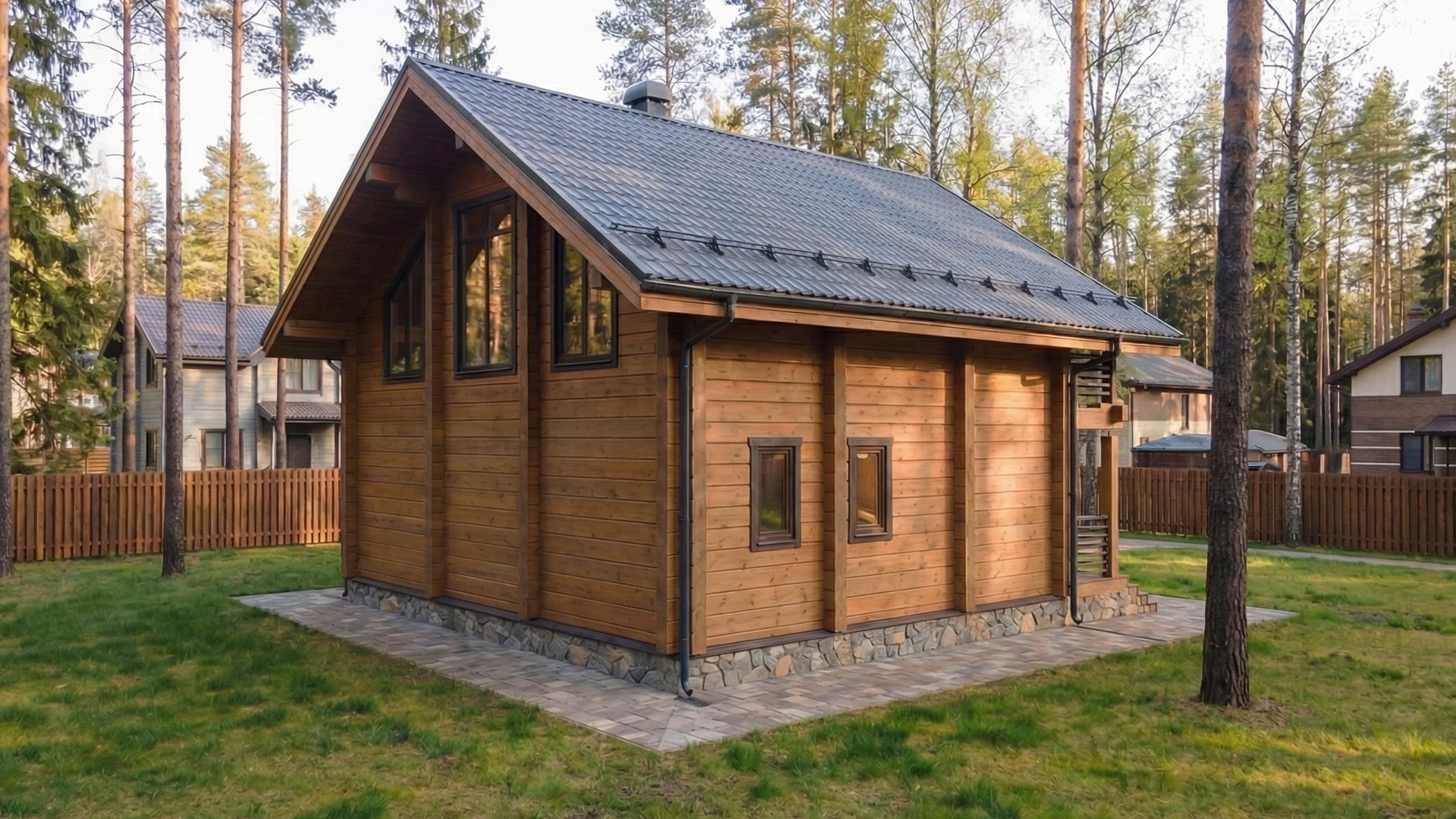 • Стропильная система из доски камерной сушки (сосна) 50х200мм, обрешетка из бруска 50х50мм, контробрешетка и внутренняя обрешеткам из доски 25х100мм.